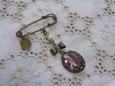 ネックレスとお揃いのグラスストーンとレース枠を使ったブローチ。